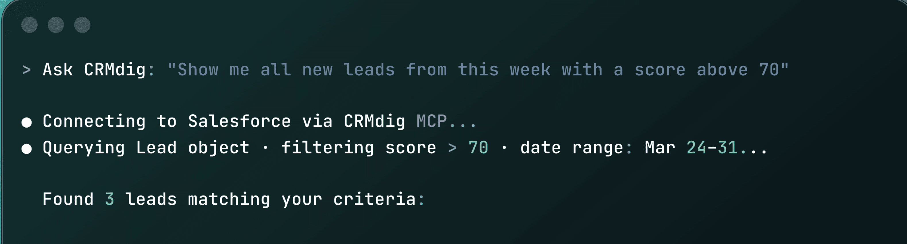 CRMdig connects any AI model to your live Salesforce data - so you can ask real questions and get real answers, without writing a single line of code.